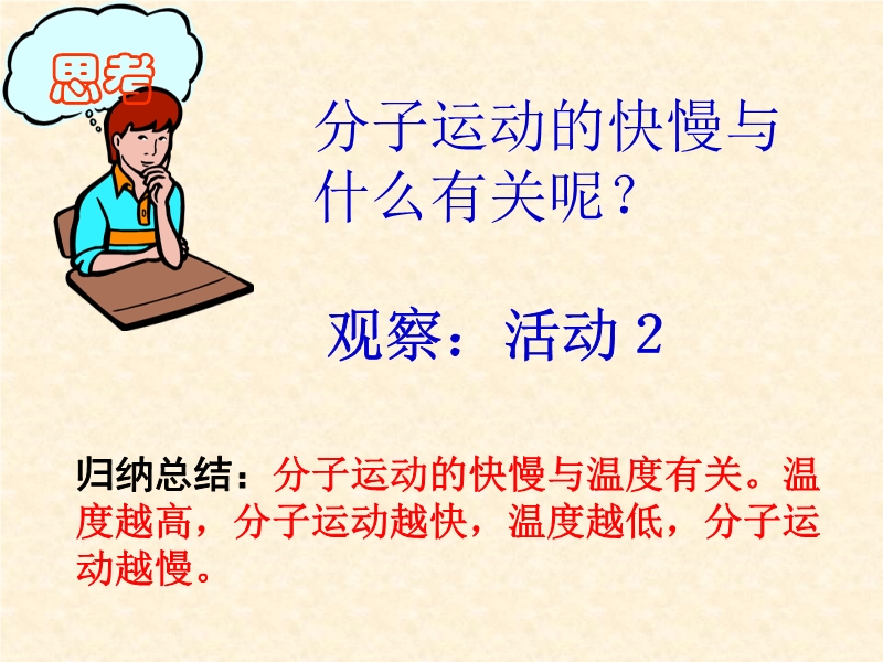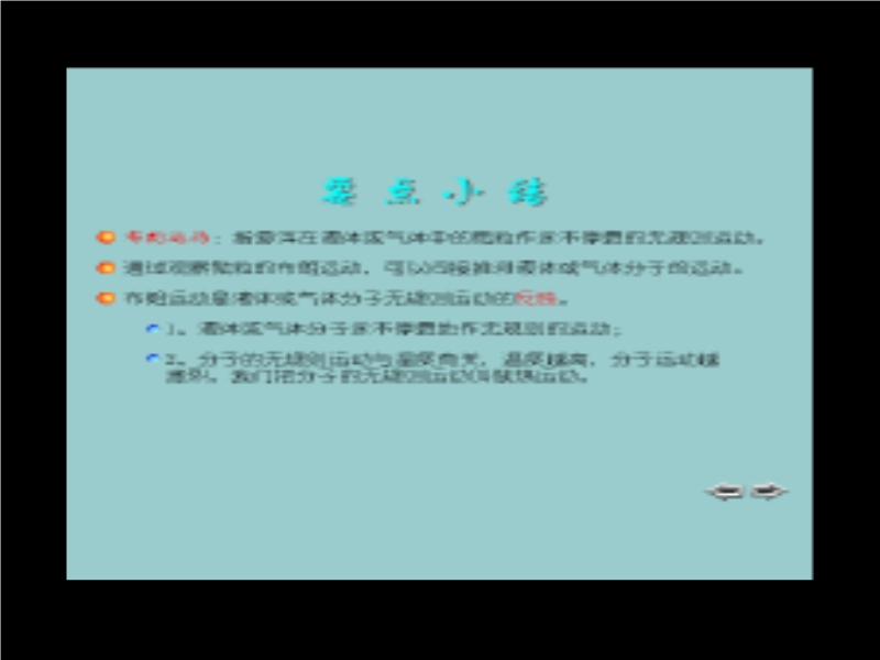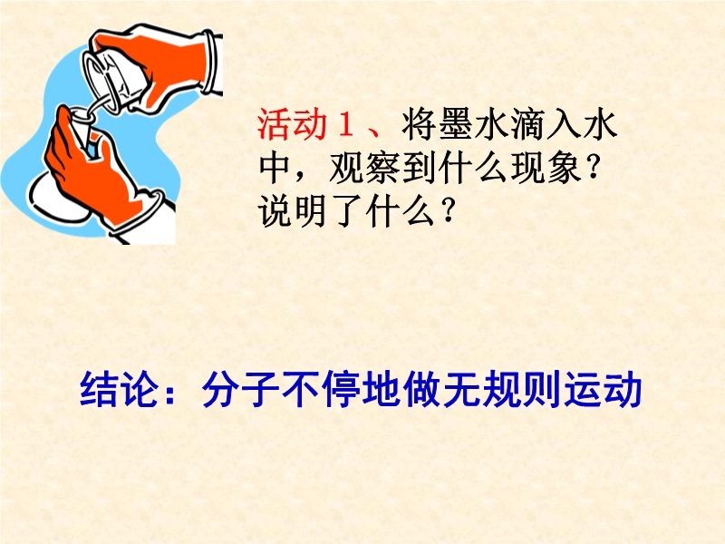 【内容简介】本课件以沪粤版教材第六章第二节为基础制作,紧扣教材,重点突出,共有21张幻灯片。主要引导学生通过观察、实验、讨论认识了有关分子动理论的初步知识,通过观察和探究,学生知道了分子在不停地做无规则运动、引导学生认识了物质的扩散现象、通过实验学生知道了分子之间有间隙、分子之间有斥力和引力,并且从理论上分析了斥力和引力的大小。本课件教学设计新颖,充分体现学生的主体作用,同时也注意培养学生的观察、实验探究能力。课件中插入了flash动画,模拟演示了物质的扩散、观察布朗运动等,使抽象的问题具体化,更易于学生的理解。
