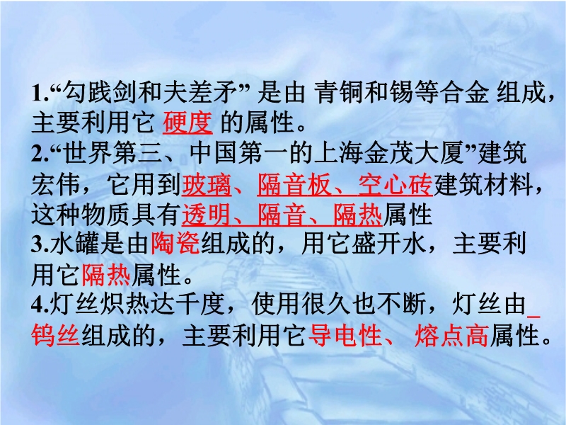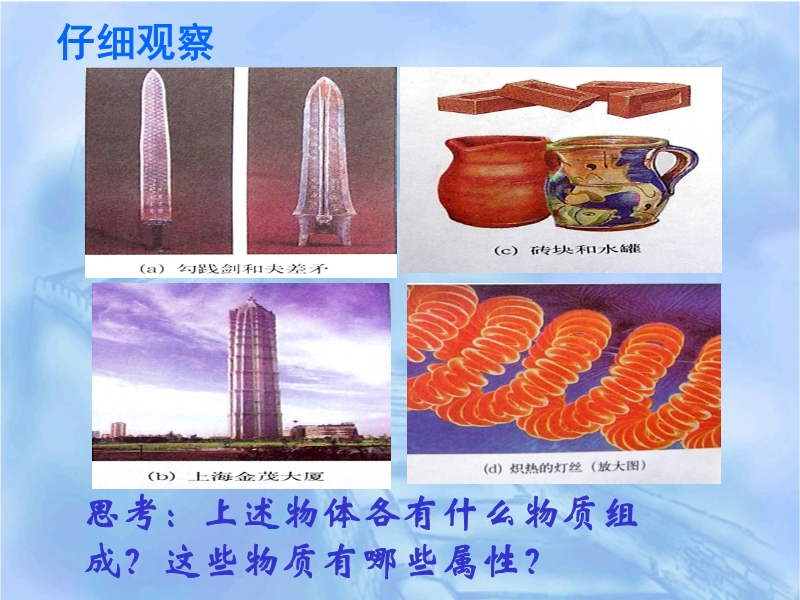 【内容简介】本课件以沪粤版新教材为基础制作,可供教学第四章第一节时参考使用,共由24张幻灯片组成。内容主要有物质的磁性、物质的导电性、物质的导热性和物质的硬度等。课件设计新颖、独特,内插了视频和flash动画,视频实验主要演示了磁体的吸铁性、磁极间的相互作用、磁体的指向性,flash动画主要模拟演示了物质的导电性、导体与绝缘体之间的转化、半导体的特点等。
