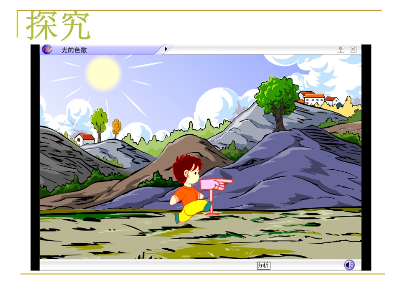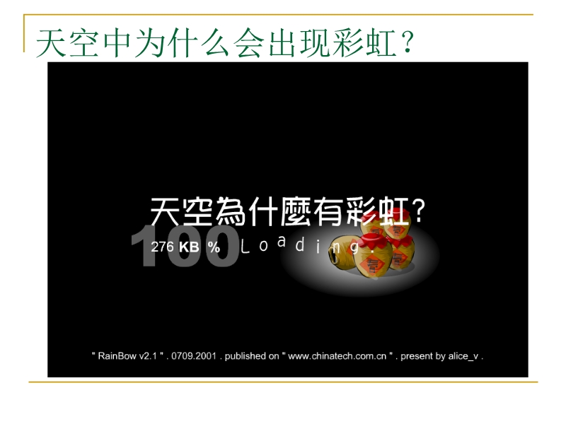 【内容简介】本课件以人教版新教材为基础制作,共由16张幻灯片组成,课件制作新颖、独特,教学过程设计科学、合理。内容主要包括光的色散、色光的混合、物体的颜色等。课件中插入了三个flash动画,向学生介绍了有关彩虹的传说,模拟演示了彩虹的形成原因;模拟演示了光的三基色的不同复合形成了各种色光的实验。使课件更生动、形象,可提高学生的兴趣和探究的欲望,值得教学时参考使用。