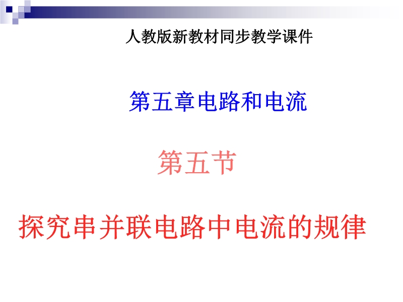 【内容简介】本课件以人教版新教材为基础制作,共由15张幻灯片组成,并插入了2个flash动画,课件制作新颖、独特。课件以科学探究 的形式、以科学探究的基本环节为线索引导学生探究了串联电路和并联电路中电流的规律。教学设计充分体现了学生的主体地位,能引导学生自主地去学习,让学生通过探究自主地建筑知识。重点突出,能抓住关键突破难点。课件中插入了两个flash动画,操作方便,交互性强,通过操作,可以进行模拟实验测量串联和并联电路中的电流。