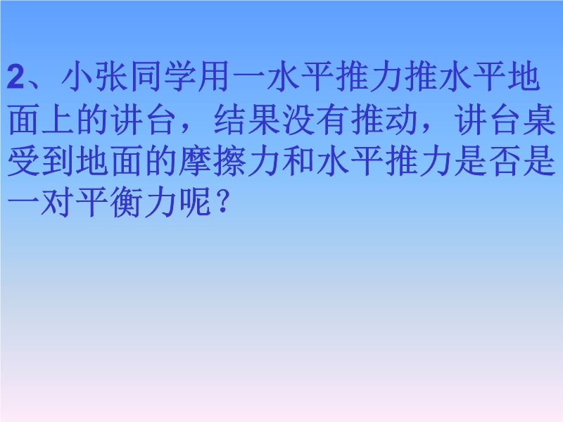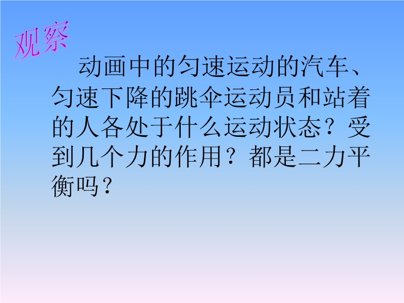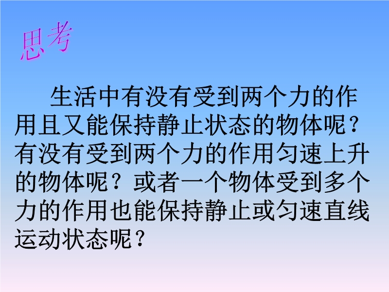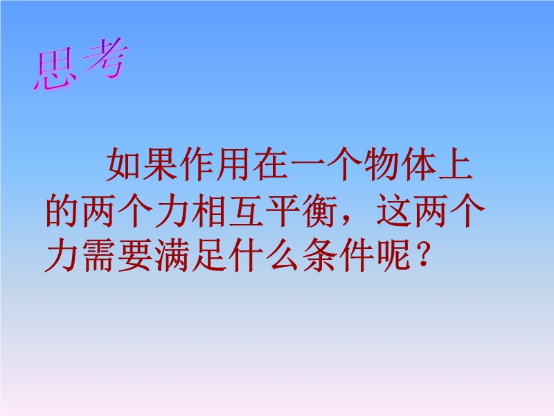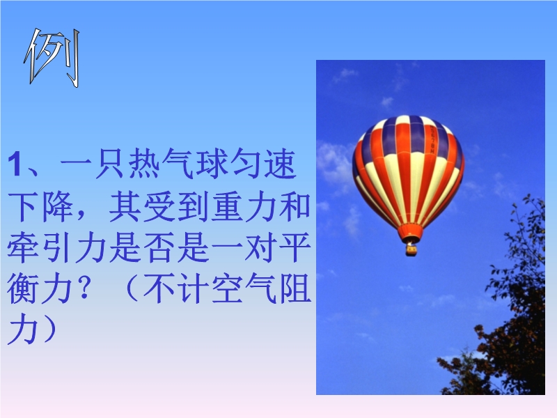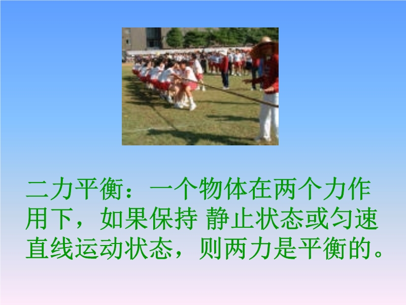 【内容简介】人教新课标第十三章运动和力中《二力平衡》PPT教学课件;课件从二力平衡的概念,二力平衡的条件及二力平衡的应用进行了祥细的讲解,并配有多个例题,课件设计新颖、紧扣教材,图文并茂,让学生更容易理解难点。