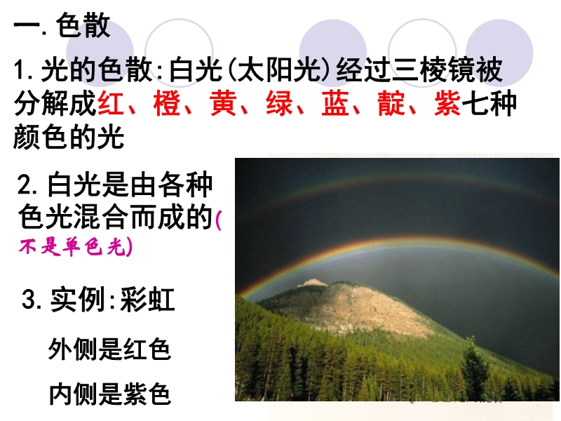 【内容简介】本课件为作者紧扣沪科版教材八年级第四章第四节自创的课件,为4.4《光的色散》整课课件,用大量图片和文字介绍了光的色散、色光的混合、物体的颜色等知识,ppt制作便于修改。