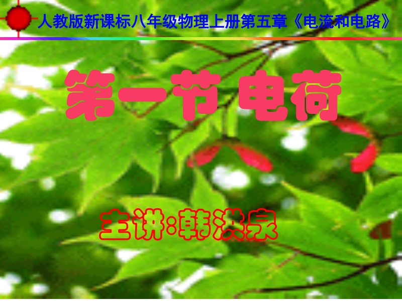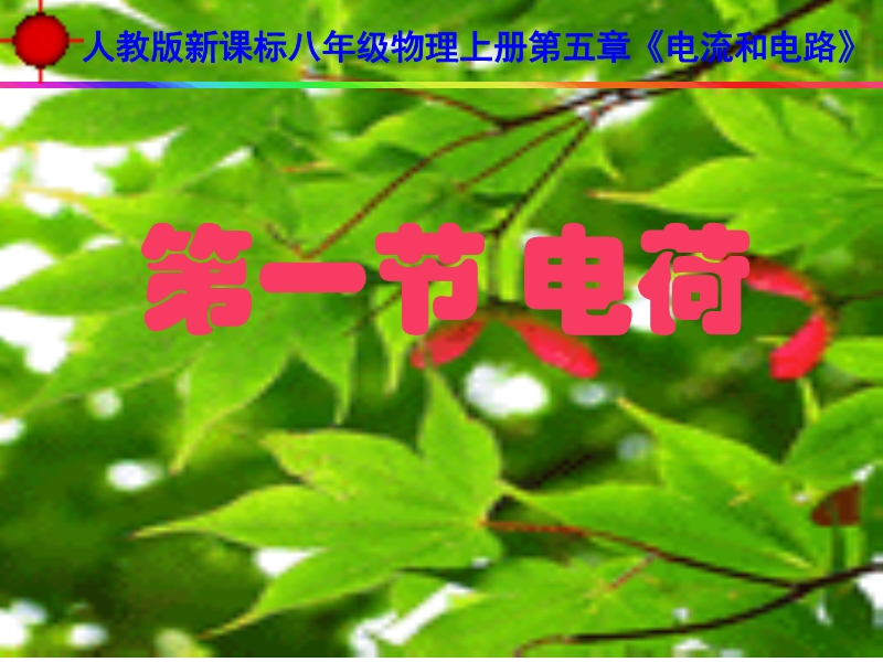 课件内容:本课件是根据新课标人教版八年级上学期第五章《电流和电路》第一节《电荷》制作而成,为《电荷》全节课件。