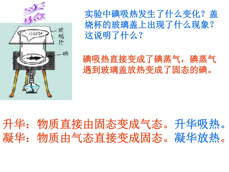 【内容简介】本课件以北师大版新教材为基础制作,共由11张幻灯片组成,课件制作新颖、独特,教学设计重点突出。主要引导学生通过观察日常生活中的现象认识了升华和凝华现象,并且通过观察实验探究了升华吸热和凝华放热。课件能以日常为主,引导学生大量观察生活实际,能激发学生积极思考、大胆发表自己的见解,并将知识应用于生活。