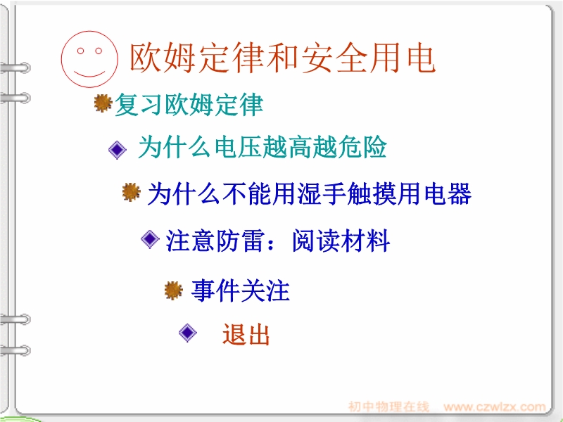 【内容简介】本课件以人教版新教材为基础制作,共由8张幻灯片组成。课件引导学生用欧姆定律的知识分析了常见的问题,如为什么电压越高越危险,为什么不能用湿手触摸用电器,怎样进行防雷等。教学过程中善于激发学生的思考,能极大地提高学生的应用能力。