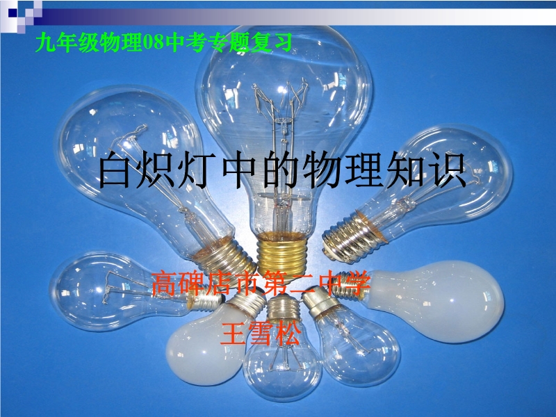 【内容简介】本课件用于08年中考专题复习(系统复习后),主要通过白炽灯为线索,把电学知识做以专题复习用。本课件不受教材版本限制,以新课标为主要依据。由于时间仓促,水平有限,有不当之处欢迎批评指正,共同交流。