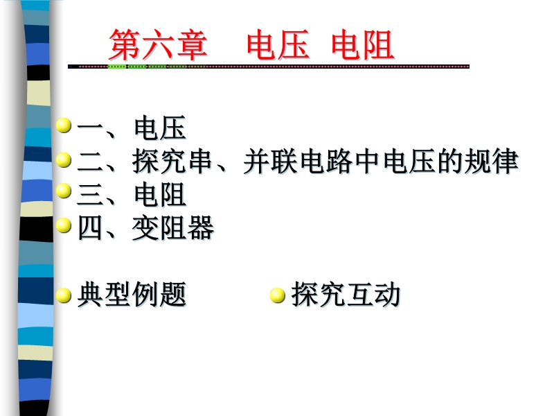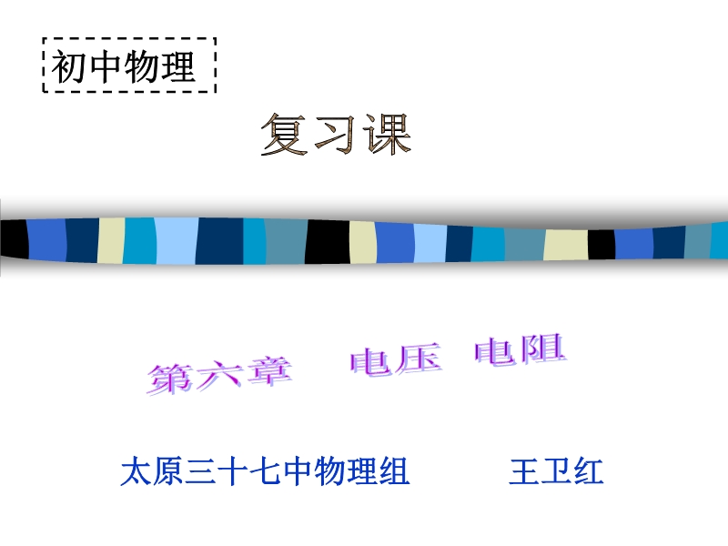【内容简介】本课件为新人教版《第六章 电压 电阻》复习课件,ppt平台制作,24张幻灯片组成,初二和初三年级复习时均适用。本课件多次参加省市的公开课,受到同行的高度评价。