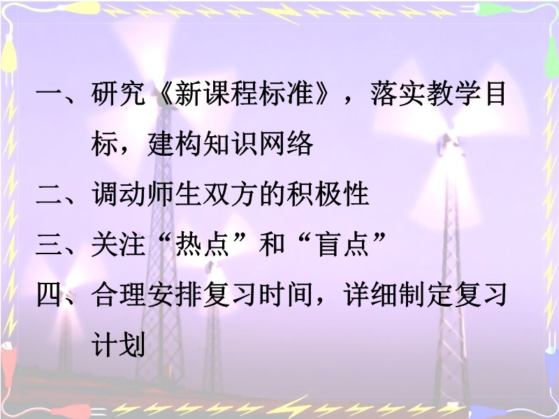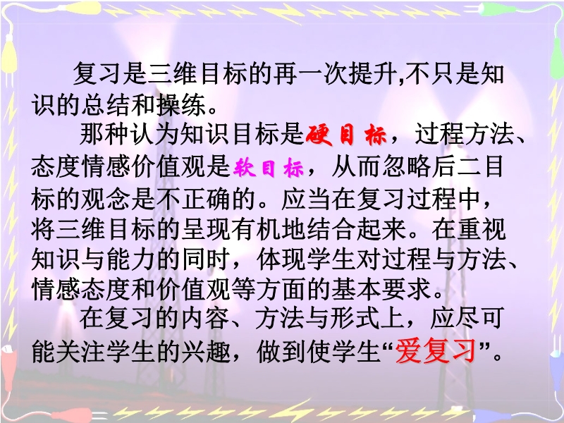 【内容简介】本课件ppt制作,由25张幻灯片组成。重点介绍中考复习的策略,复习是三维目标的再一次提升,不只是知识的总结和操练。 那种认为知识目标是硬目标,过程方法、态度情感价值观是软目标,从而忽略后二目标的观念是不正确的。应当在复习过程中,将三维目标的呈现有机地结合起来。在重视知识与能力的同时,体现学生对过程与方法、情感态度和价值观等方面的基本要求。 在复习的内容、方法与形式上,应尽可能关注学生的兴趣,做到使学生“爱复习”。 本课件可以对你在中考复习中有很大帮助,欢迎下载。