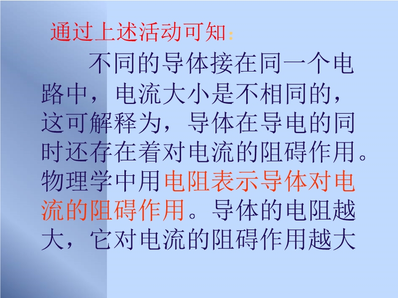 【内容简介】该课件由28张幻灯片和6个flash组成,利用flash突破电阻的大小因素的影响的探究,突破了难点,还有大量的练习加深了学生对知识的应用能力的提高