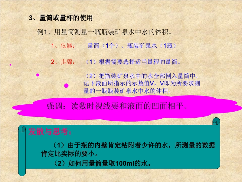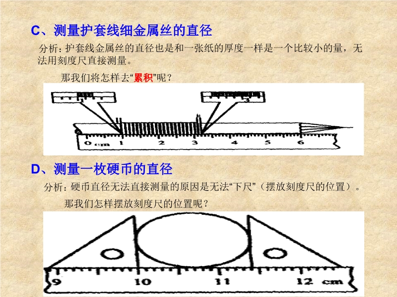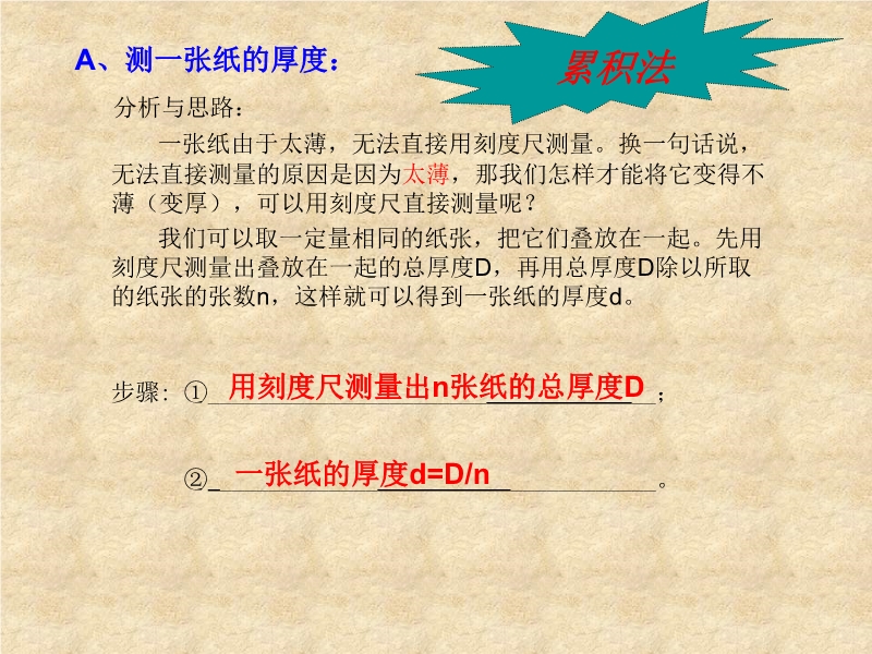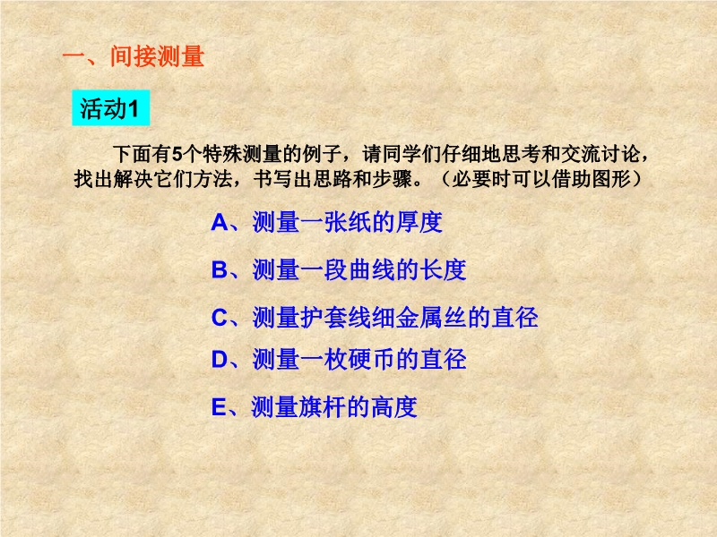 【内容简介】本课件以沪粤版新教材第一章第三节为基础制作,共有13张幻灯片。课件引导学生通过具体的测量活动认识了几种间接测量的方法,如累积法、以直代曲法、分割法、滚轮法等,课件还引导学生学习了量筒和量杯的使用方法,并用具体的事例引导学生探究如何用量筒测量不规则固体的体积,最后引导学生讨论了如何估测长度和时间。课件制作生动、内容具体,重点突出。