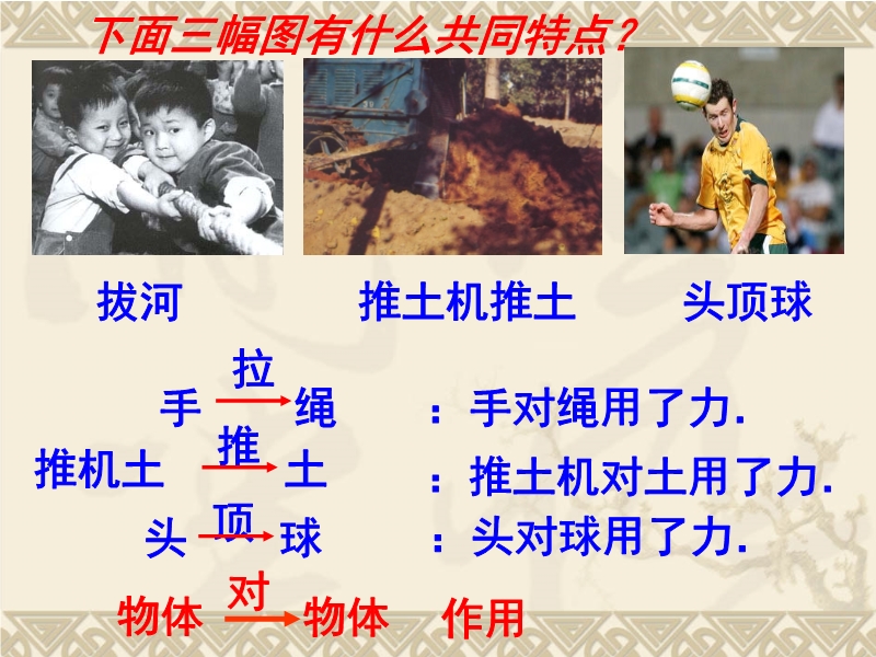 【内容简介】本课件以人教版新教材第十二章第四节为基础制作,共有33张幻灯片,并嵌入了三个flash动画。课件以大量的精彩的图片向学生展示了力的存在,让学生更好地理解了力的概念,认识了力的作用效果等。为了让学生更好地理解力的三要素,课件中用flash动画引导学生进行模拟实验,更形象地认识了力的三要素,课件以具体的例子引导学生总结了如何画力的示意图。课件制作新颖,图片清晰。