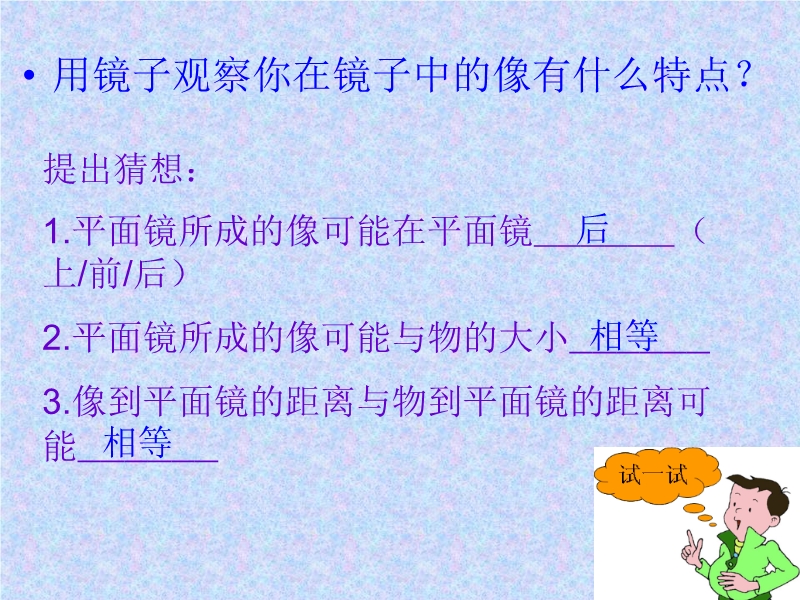【内容简介】本课件以苏科版新教材第三章第四节为基础制作,共有15张幻灯片。课件主要引导学生通过设计实验探究和总结了平面镜成像的特点,重点在于引导学生如何设计实验,教学思路清晰、新颖,课件还引导学生探究了平面镜成像的作图方法,课件中习题有基础题、提高题、拓展题等,可供教学“平面镜”时参考使用。