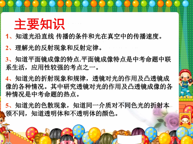【内容简介】本课件以中考复习为宗旨引导学生系统地复习了光学部分的内容,共有21张幻灯片,教学设计重点突出,将内容分为以下几个板块:光的直线传播、光的反射、光的折射、平面镜成像、透镜成像等,复习较详细、具体,课件还精选了典型的习题,可供课堂练习和巩固提高时参考使用。