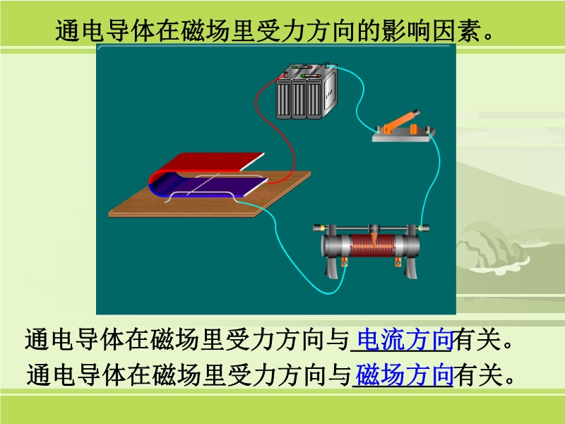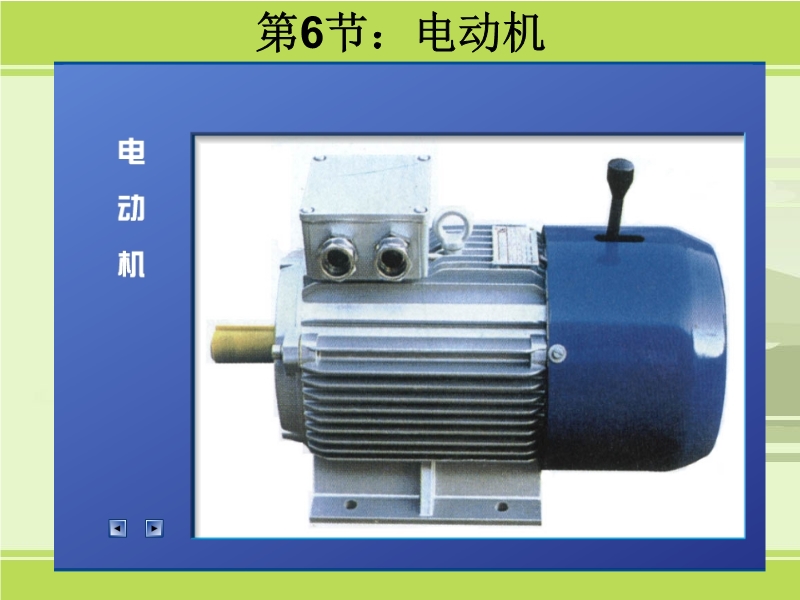【内容简介】《20.4电动机》课件为ppt+flash 形式。ppt课件由19张幻灯片组成,内嵌多个精致flash动画课件。课件由三部分组成第一部分是磁场对电流的作用,第二部分是介绍直流和交流电机结构和动作原理以及应用。每部分都由习题和逼真又生动的flash动画操作。