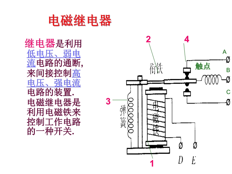 【内容简介】本课件以人教版新教材第九章第五节为基础制作,共有14张幻灯片,并插入了一个flash动画。课件展示了电磁继电器的基本构造和原理,讨论了电磁继电器的使用方法,通过练习的方式引导学生利用电磁继电器来设计一些控制电路。课件展示了扬声器的基本构造和原理。课件利用flash动画展示了扬声器的原理、电磁继电器的原理、电铃的构造原理、水位报警器、恒温箱的原理等,使教学内容更具体、形象。