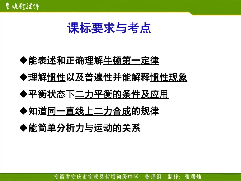 【内容简介】本课件以人教版新教材为基础制作,共有22张幻灯片,并插入了5个flash动画,使课件更生动、形象。,主要引导学生复习牛顿第一运动定律、惯性、运动和静止的描述、运动和力的关系等系统而详细地总结了基础知识,精选了适量的习题,能开发学生的智力,开拓学生的思维。