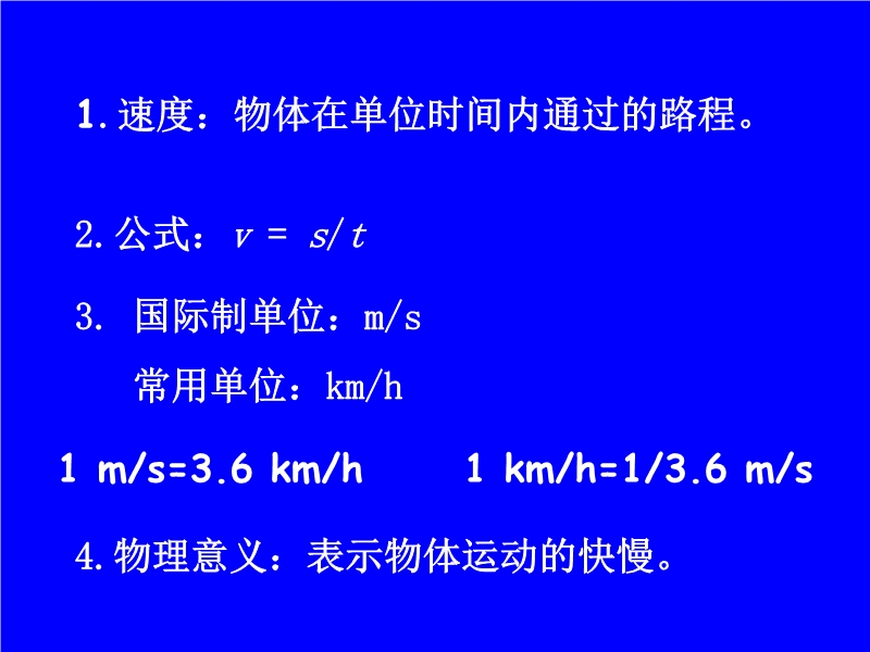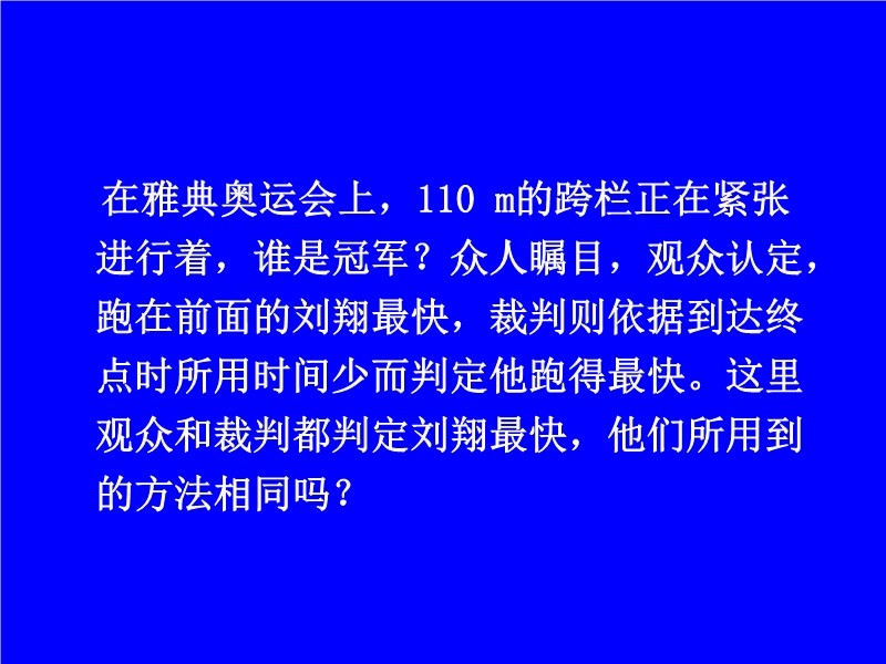 【内容简介】本课件以北师大版新教材第三章第二节为基础制作,共有17张幻灯片,并插入了一个视频文件和一个flash动画。课件用视频和动画展示生活中的实例,引导学生讨论了比较物体运动快慢的方法,在此基础上,引导学生学习了速度的概念、意义、单位、计算等。课件中有例题和习题,可供教学“运动的快慢”时参考使用。