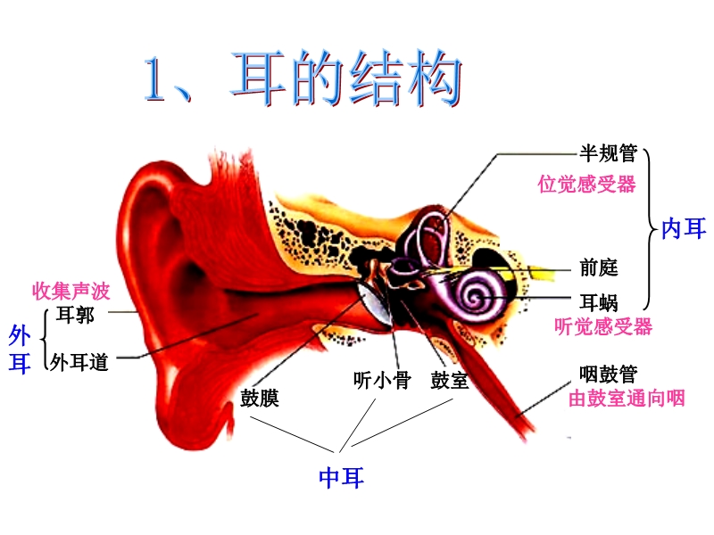 【内容简介】本课件以人教版新教材第一章第二节为基础制作,共有20张幻灯片,并插入了一个flash动画。课件展示了人耳的基本结构及部分的功能,用flash动画展示了听觉的形成过程,向学生介绍了发生耳聋的原因,展示了双耳效应等。课件中还有巩固练习,可供教学“声音的传播”时参考使用。