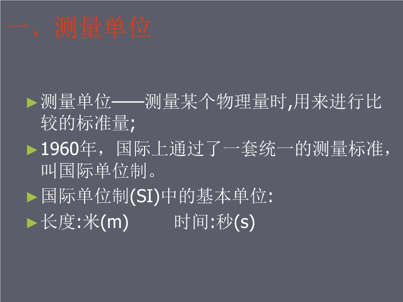 【内容简介】本课件以沪科版新教材第二章第二节为基础制作,共有26张幻灯片,并插入了四个flash动画。课件引导学生学习了长度的单位及换算、刻度尺的使用、时间的单位及换算、时间的测量、测量误差的概念、长度的间接测量等。用flash动画模拟演示了“机械式秒表”的使用,几种间接测量的方法等。本课件可供教学“长度与时间的测量”时参考使用。