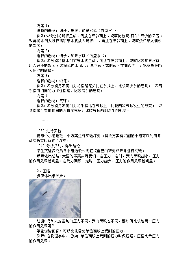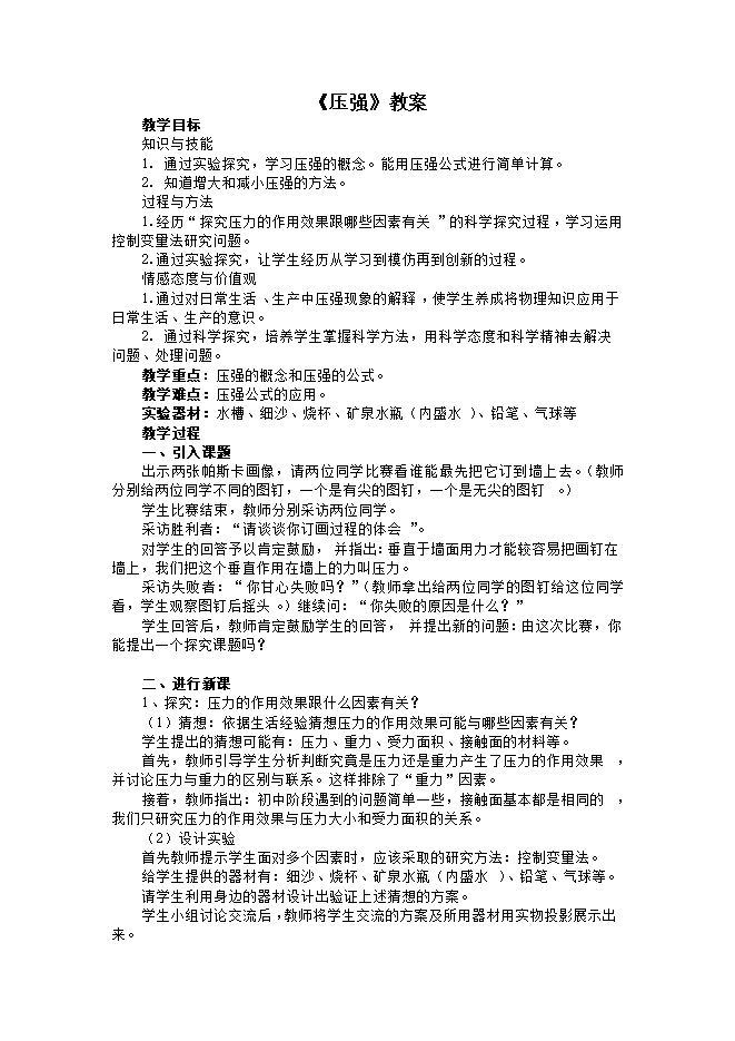 【内容简介】本课件以人教版新教材第十四章第一节为基础制作,共有12张幻灯片,插入2个视频和一份教案。课件以引导学生认识了压力的概念,重点压力的作用效果与哪些因素有关;归纳了压强;通个2个视频认识到增大和减小压强的方法。