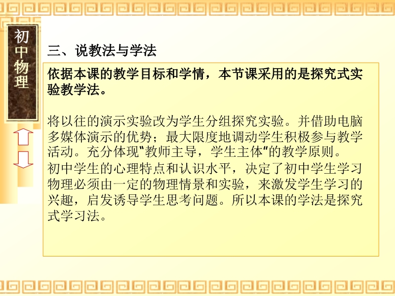 【内容简介】课件是液体的压强的说课课件,压缩包内含ppt和一篇说课稿,课件从 教材的地位,教学目标,教学的重点和难点,学情,教法学法,而重点对教学的过程作出了详细的展示。
