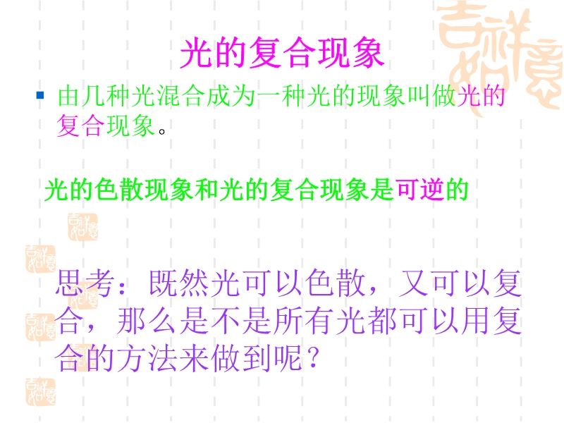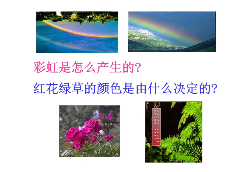 【内容简介】本课件以沪科版新教材第四章第四节为基础制作,共有29张幻灯片,并插入了两个flash课件。课件展示了光的色散现象,引导学生认识了白光的组成及光的复合现象,并用flash动画模拟演示了色光的混合及颜料的混合,课件引导学生讨论了物体的颜色问题等。课件还精选了适量的习题,可作巩固练习使用。