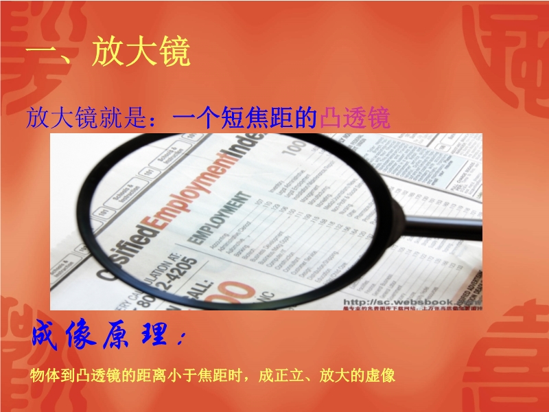 【内容简介】本课件以沪科版新教材第四章第七节为基础制作,共有19张幻灯片。课件引导学生认识了放大镜、显微镜、望远镜、照相机、投影仪的成像原理,展示了显微镜、望远镜、投影仪的基本构造,课件制作图片清晰,能更好地解决教学中的难点,帮助学生理解。本课件可供教学“显微镜、望远镜、投影仪”时参考使用。