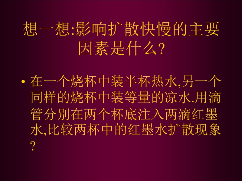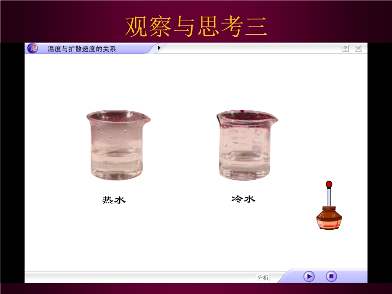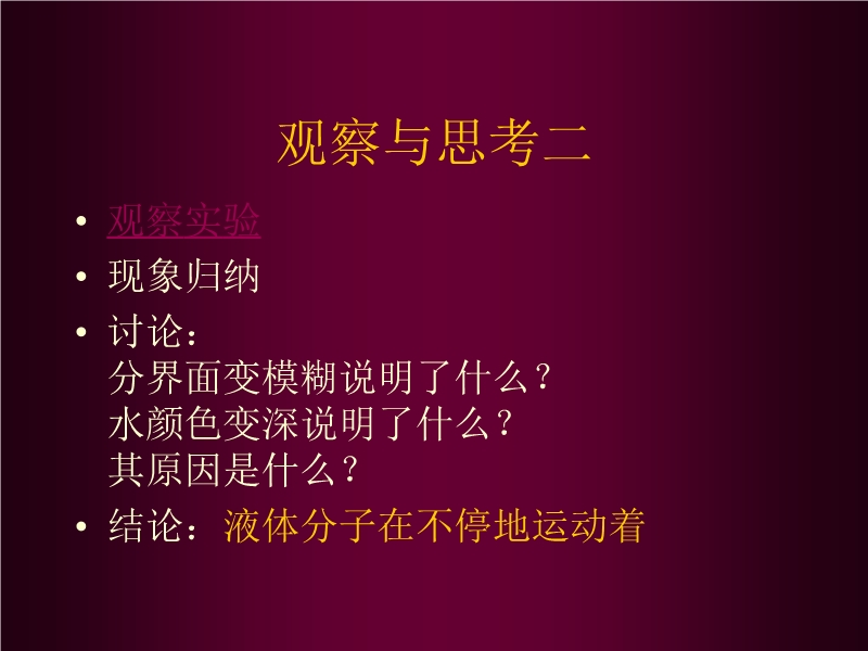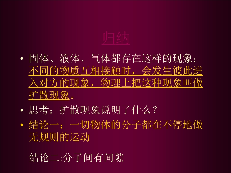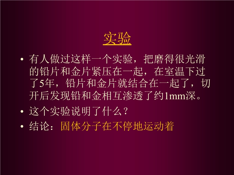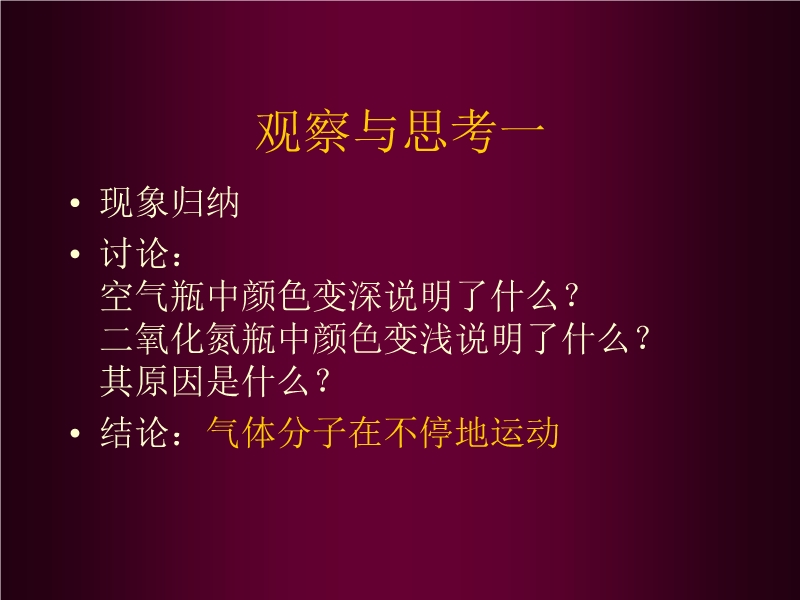 【内容简介】本课件以人教版新教材第十六章第一节为基础制作,共有26张幻灯片,并插入了4个视频,使课件更生动、具体、形象,增强了课件的直观性。课件主要引导学生观察和讨论了有关分子的运动,认识了扩散现象,用视频演示了分子运动与温度的关系,最后总结了分子运动论的内容。