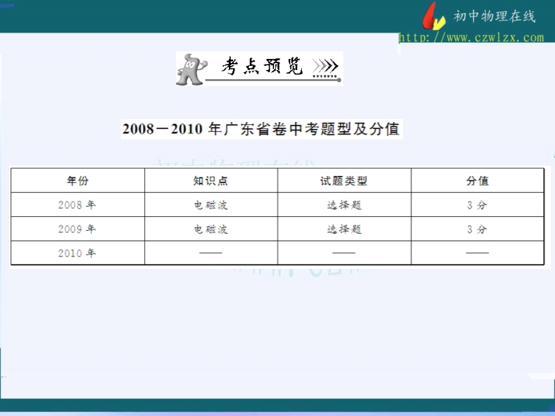 【内容简介】本课件以中考复习制作,共有23张幻灯片,课件内容主要有电磁波的特点、电磁波的波速、波长、频率的关系、如何区分声波和电磁波、电磁波的应用等。课件精选了2010年中考习题,主要针对重点和难点进行练习。