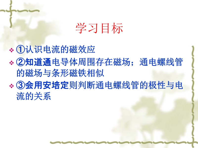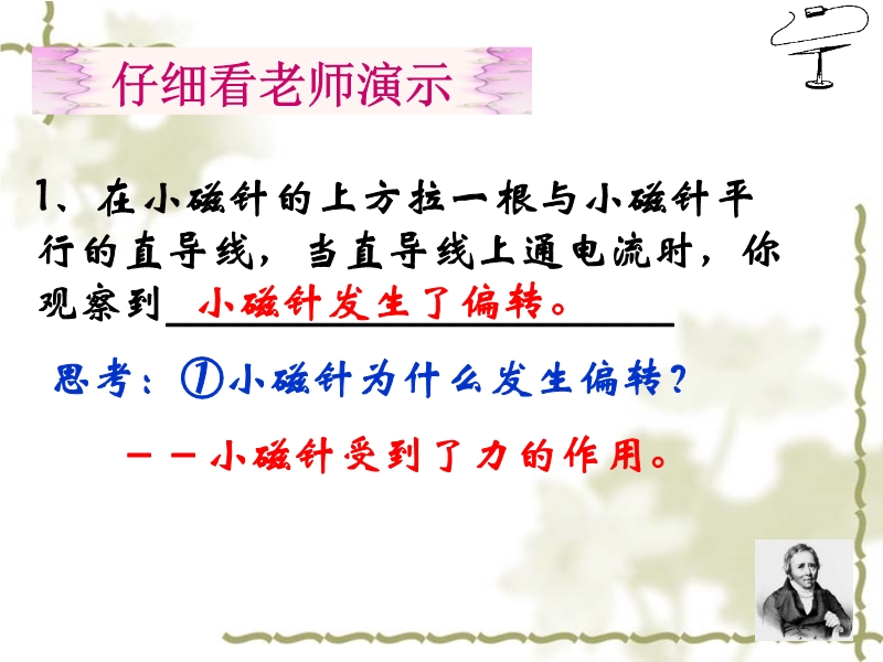 【内容简介】课件共有18张幻灯片和2个flash。课件通过flash动画模拟演示了通电地导线周围存在磁场的实验现象,并演示了磁场的方向与电流方向的关系。课件用图片和动画展示了通电直导线周围的磁场的分布特点,较直观,引导学生研究了通电螺线管的磁场的特点,展示了右手螺旋定则。