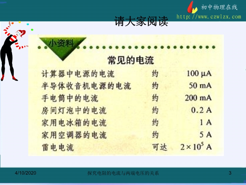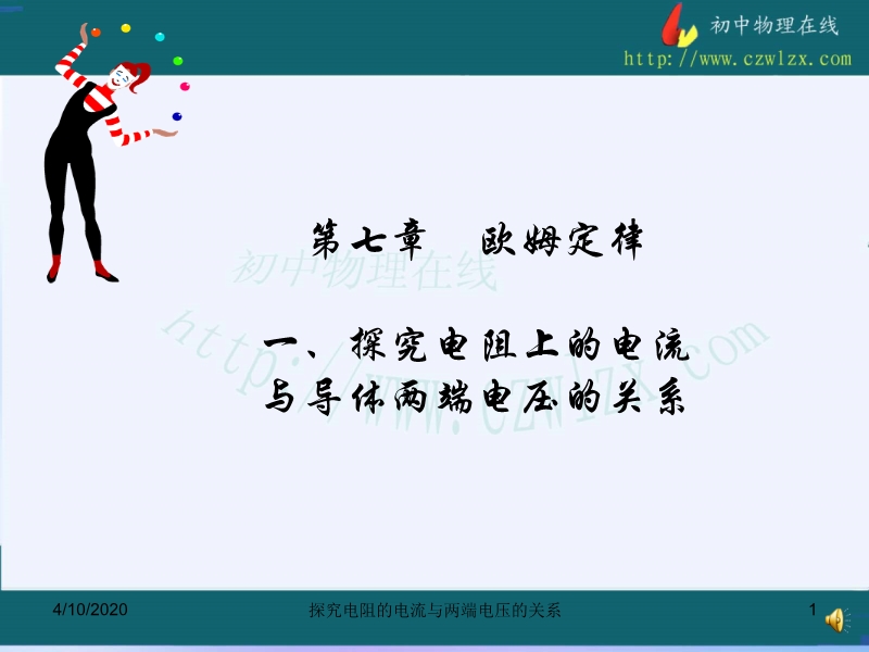 【内容简介】课件共14张幻灯片,1个flash。引导学生运用控制变量法探究“电阻上的电流跟两端电压的关系”,同时展示了电流跟两端电压的函数关系图像,让学生进一步理解电阻上的电流跟两端电压的关系。