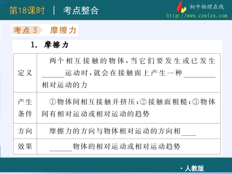 【内容简介】本课件以人教版新教材第十五章为基础制作,课件共32张幻灯片。主要引导学生系统地复习了重力 弹力和摩擦力的内容,教学设计的特点:结合2010年的中考试题有效地将知识与习题相结合,能有效的对本节的知识点进行归纳总结,本课件供2011年中考复习时参考使用。