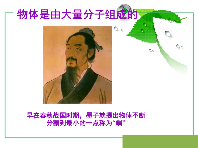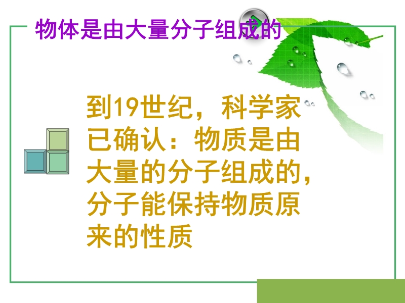 本课件以教科版新教材九年级第一章第一节为基础制作,共有23张幻灯片,课件引导学生认识了物质是由分子组成的,了解了分子的大小。说明分子在不停地运动,引导学生讨论了分子之间的作用力,较形象。