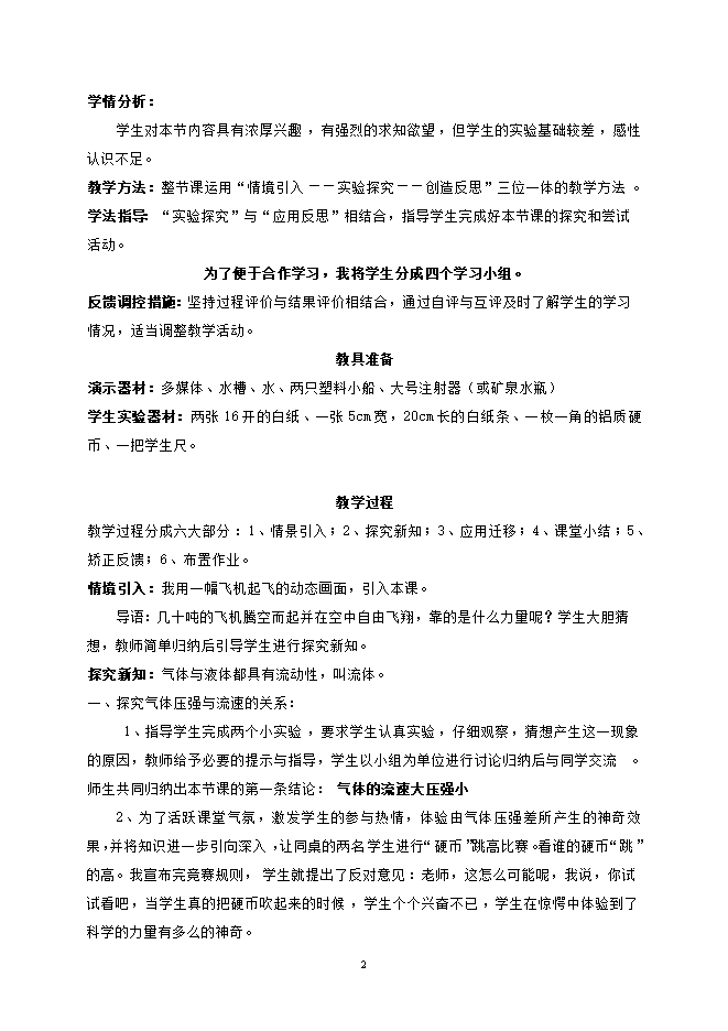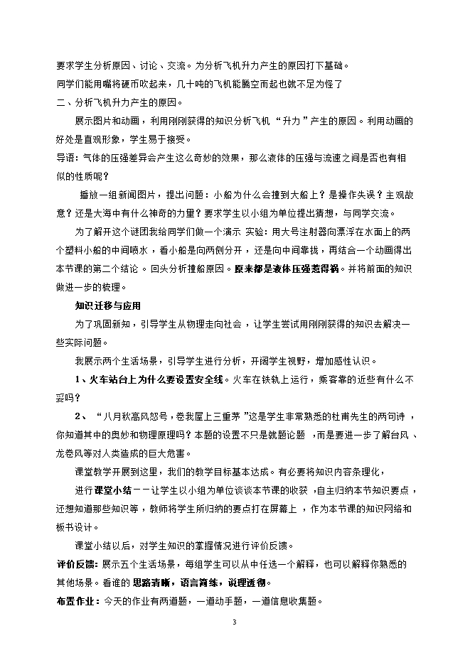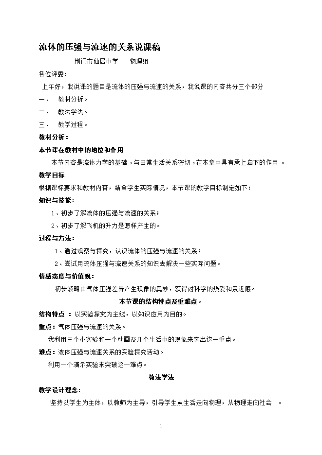 荆门市仙居中学:《流体压强与流速的关系》ppt说课课件+word说课稿(内附视频和flash动画)