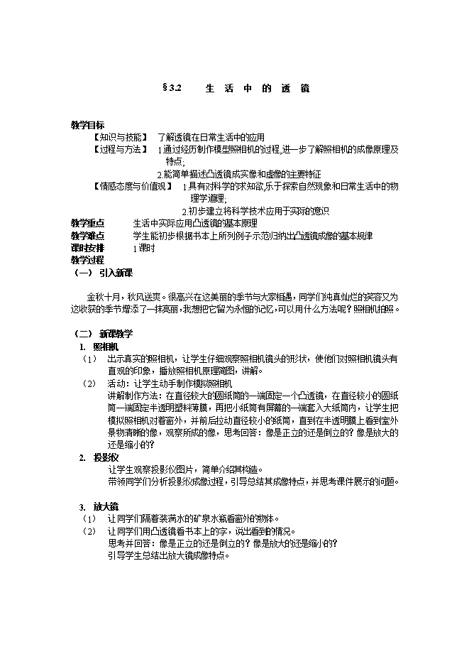 2011年安庆市物理优质课参赛作品2:《3.2生活中的透镜》(内附教案和动画)