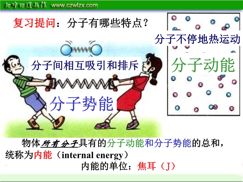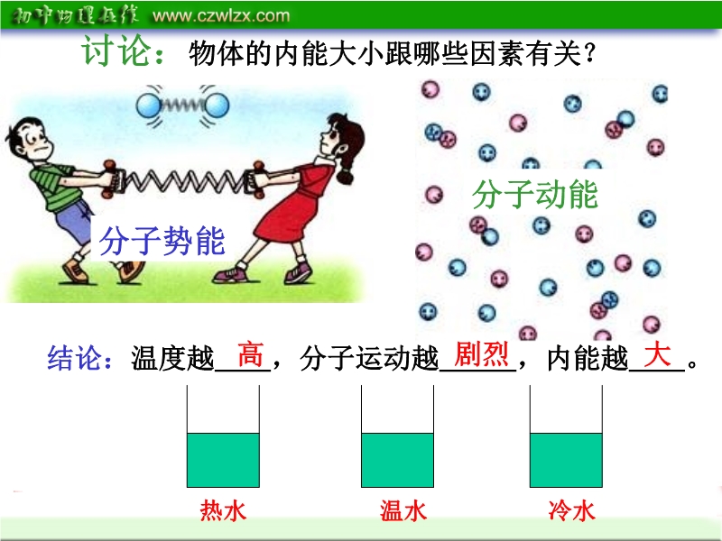 【内容简介】课件以人教版新教材第十六章第一节为基础制作,共由14张幻灯片。课件主要以教材为本,引用大量教材上的图片引导学生学习,引导学生通过观察日常生活中的现象或小实验探究了有关分子运动的规律,课件制作生动、形象,能吸引学生的注意力。