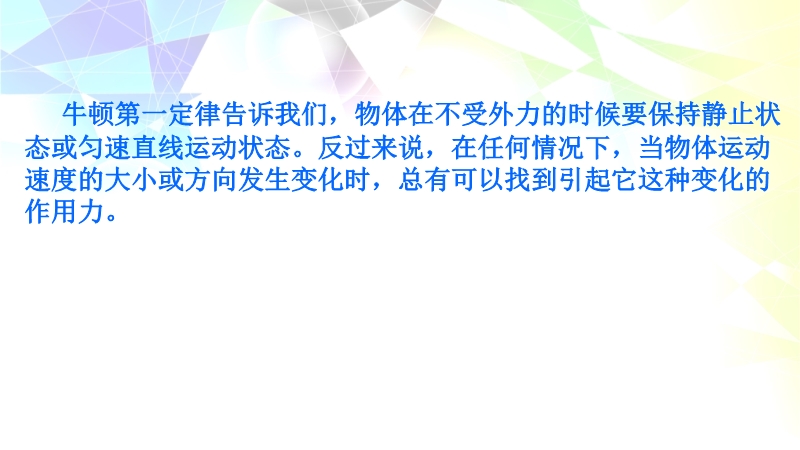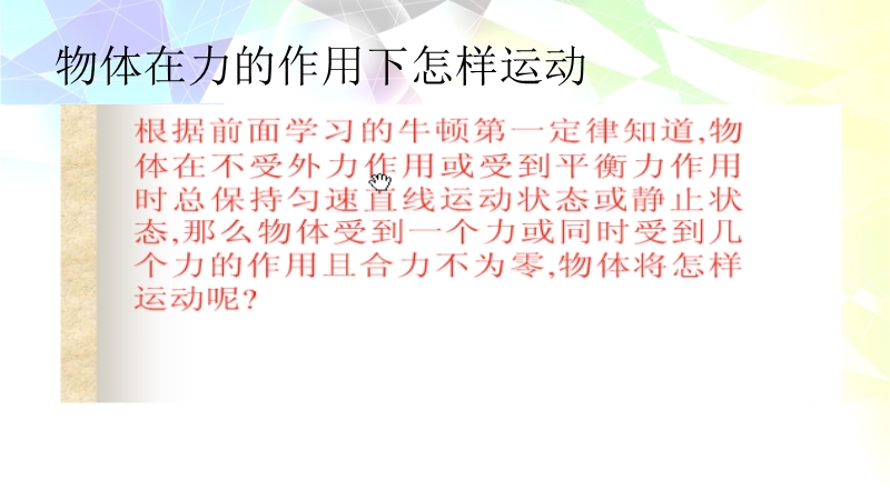 【内容简介】本课件以教科版教材第八章第四节为基础制作,共有19张幻灯片。课件引导学生分析了物体的运动状态发生改变的几种情况,分析了它们的受力情况,总结了物体运动状态发生改变的原因,也分析了物体受平衡力作用时怎样运动等。本课件可供教学“力与运动”时参考使用。