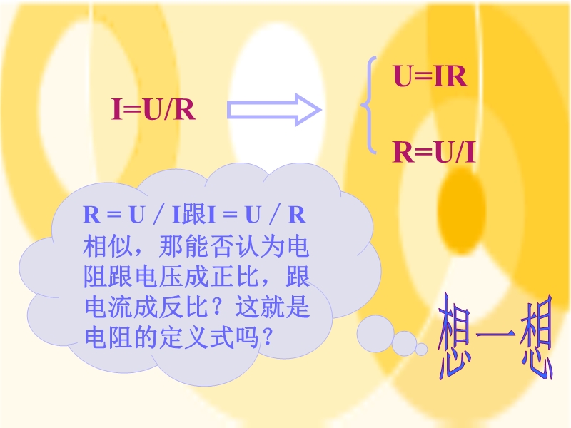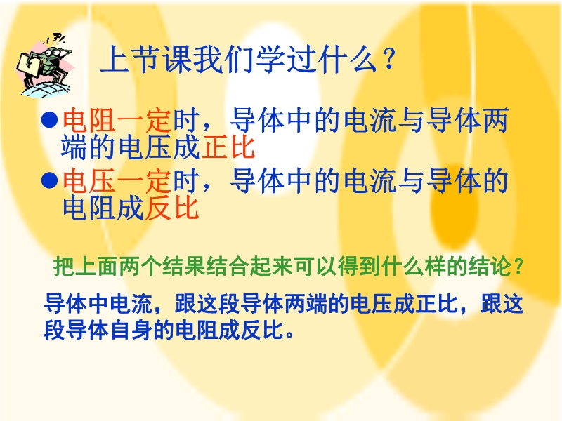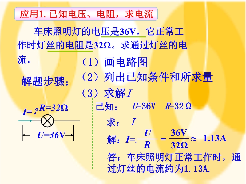 把上节课学习的内容结合起来,得出欧姆定律的内容。让大家觉得欧姆定律我们自己也能总结出来,让大家觉得欧姆定律很熟悉。对于计算题,课件中有完整的解题过程,学生刚接触计算题,能够起到很好的规范作用。