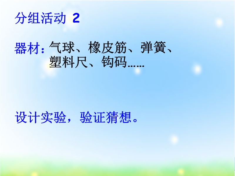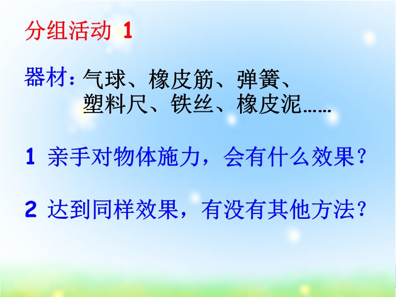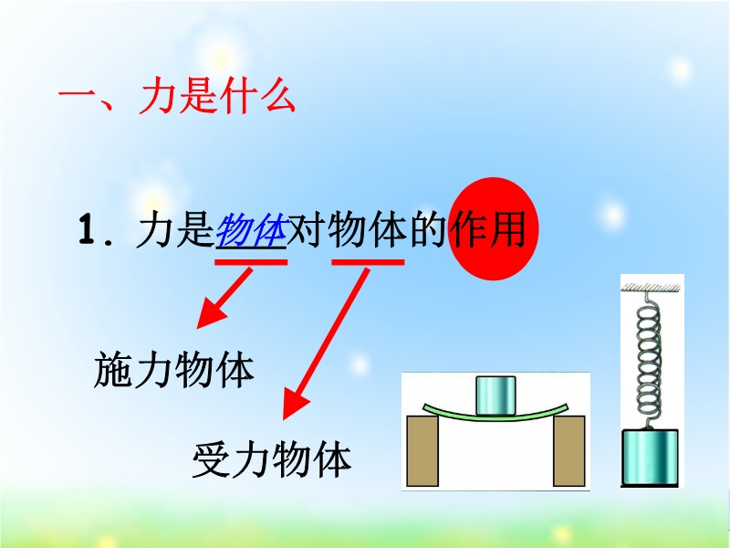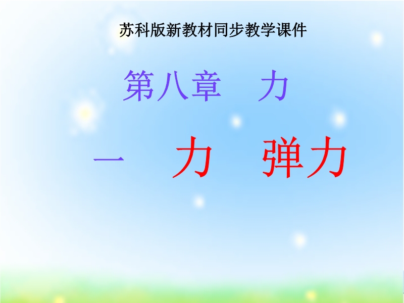 【内容简介】本课件以苏科版新教材第八章第一节为基础制作,共有23张幻灯片。本课件首先引导学生认识了什么是力,展示并讨论了力的作用效果,并让学生通过具体的实验去感受力。课件还展示了弹簧测力计的基本构造,讨论了它的原理,引导学生练习了它的使用,总结了它的使用方法等。本课件可供教学“力弹力”时参考使用。