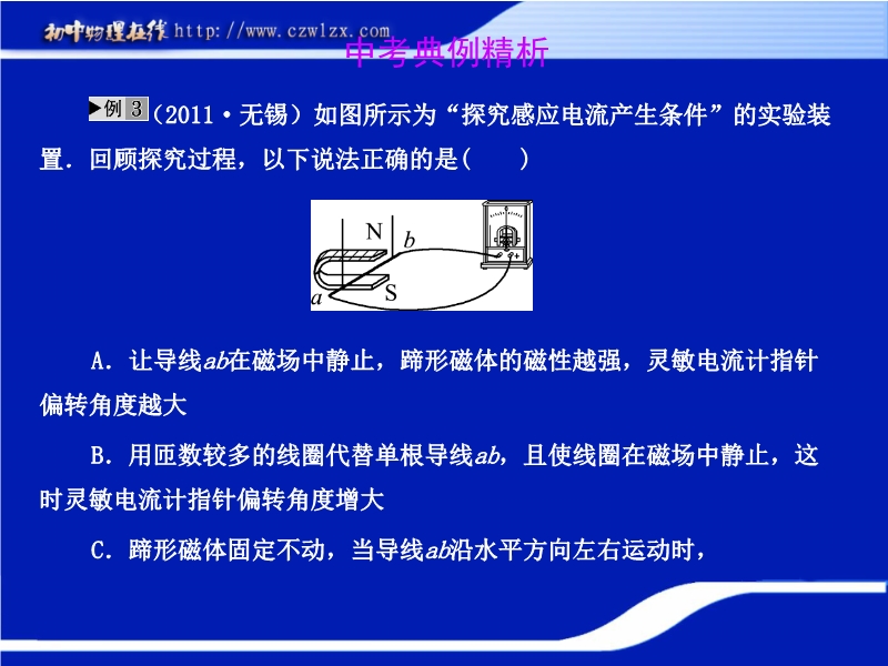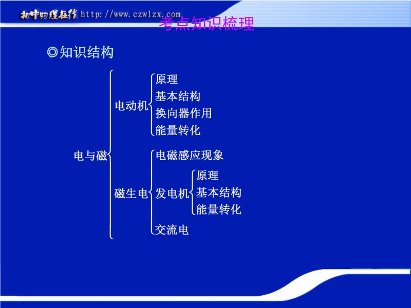 【内容简介】本课件为2012年中考复习制作,共有40张幻灯片。课件复习的内容是电学知识点:电动机、磁生电。课件采用四个模块:“考点知识梳理 中考典例精析 课堂达标训练 专题训练”,课件注重对知识的构造,通过中考中考典例精析突破知识的重点和难点,课堂达标训练培养学生的运用知识的能力,课件每道中考试题都有点评和答案,课件讲究实效,是中考复习中的精品课件。