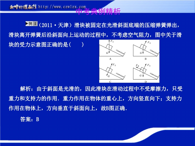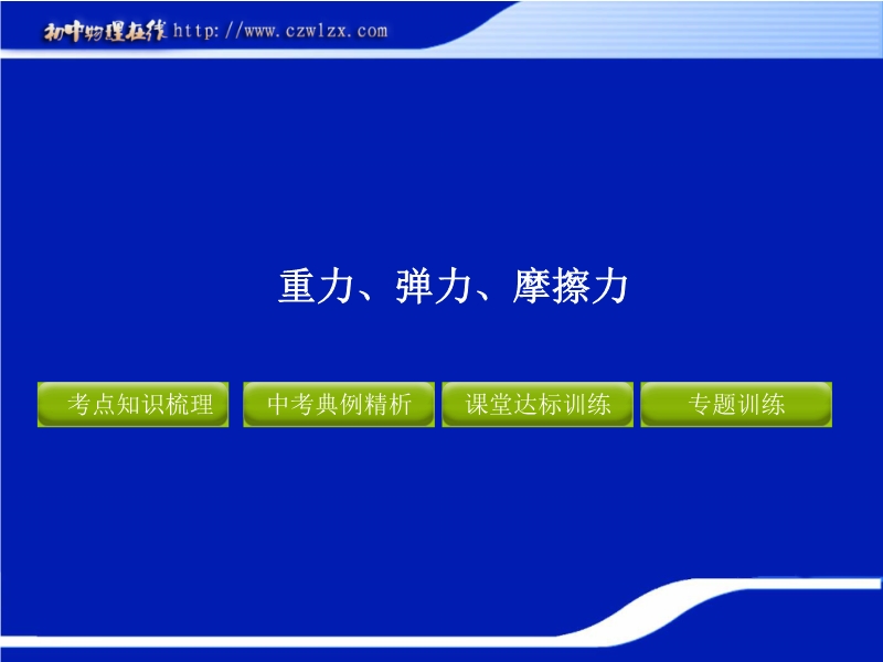 【内容简介】本课件为2012年中考复习制作,共有43张幻灯片。课件复习了:重力、弹力、摩擦力。课件采用四个模块:“考点知识梳理 中考典例精析 课堂达标训练 专题训练”,课件注重对知识的构造,通过中考中考典例精析突破知识的重点和难点,课堂达标训练培养学生的运用知识的能力,课件每道中考试题都有点评和答案,课件讲究实效,是中考复习中的精品课件。