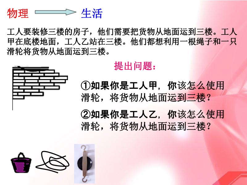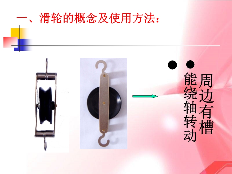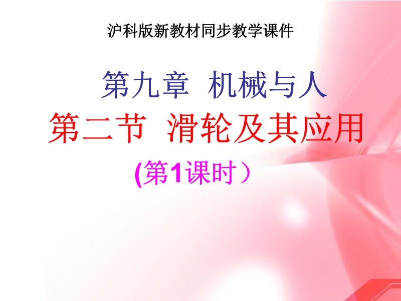【内容简介】本课件以沪科版新教材第九章第二节为基础制作,可供本节教学第一课时使用,共有20张幻灯片。课件首先向学生展示了滑轮的结构,然后让学生具体讨论了滑轮在生活中的具体应用,并根据具体的使用方法引导学生应用杠杆知识对滑轮进行分析,认识了动滑轮和定滑轮,分析了它们的本质,课件最后展示了滑轮在生活中的应用。本课件可供教学“动滑轮和定滑轮”时参考使用。