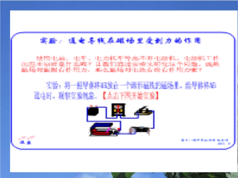【内容简介】本课件以人教版新教材第九章第六节为基础制作,共有24张幻灯片,并插入了2个flash动画。课件引导学生探究了磁场对电流有力的作用,用flash动画展示了直流电动机的工作原理,动画制作生动、形象、具体,分析详细,能更好地解决教学中的难点。