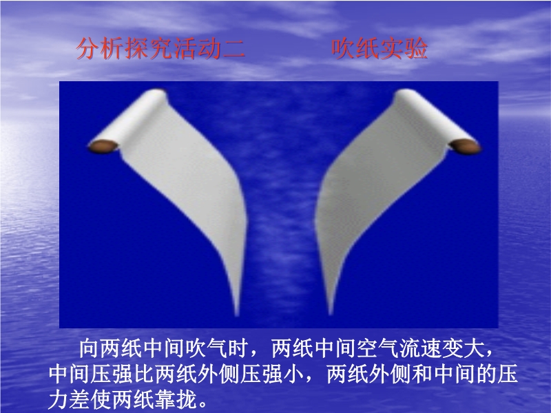 【内容简介】本课件以北师大版新教材第八章第六节为基础制作,共有20张幻灯片。课件首先引导通过小实验体验了流体压强与流速的关系,总结了结论,实验设计简单、易操作,能提高学生的动手能力。然后引导学生讨论了飞机为什么能上天,总结了升力产生的原因,并展示了它的应用等。本课件可供教学“流体压强”时参考使用。