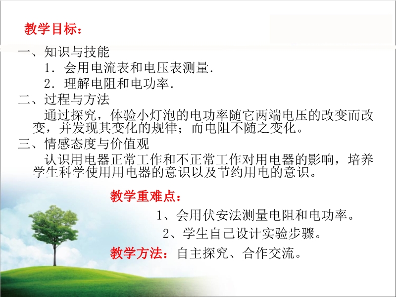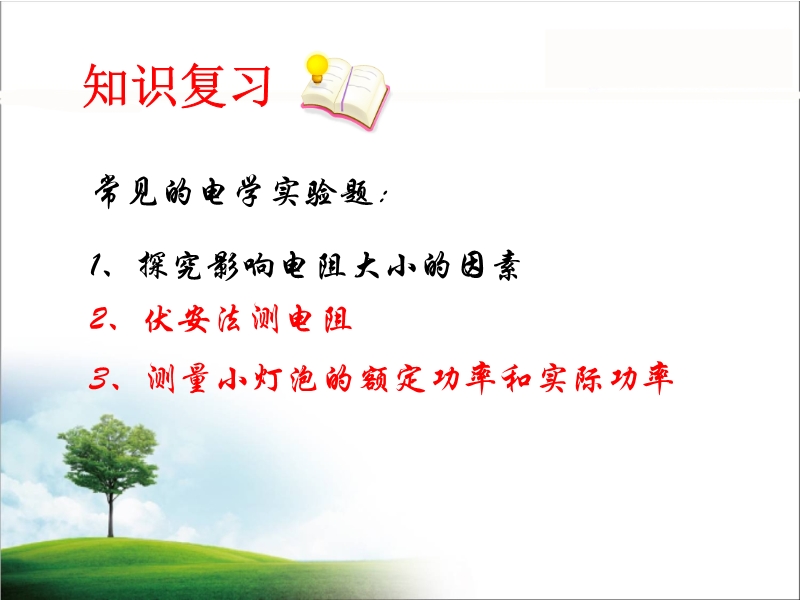 【内容简介】课件共19张幻灯片,内嵌3个flash动画,课件引导学生复习了电学两个重要试验:测电阻和测量功率,采用对比复习法,精选了部分典型试题,提高学生运用知识的能力。