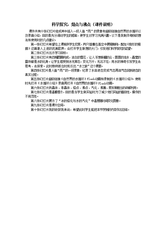 【内容简介】本课件以沪科版新教材第十一章第一节为基础制作,共有10张幻灯片,并插入了两个视频和1个flash动画。课件主要引导学生认识了自然界中的水循环过程及在此过程中发生的一些现象,动画模拟演示了晶体深化的过程和液体沸腾的过程,现象明显,并具有很好的交互性。