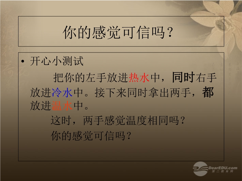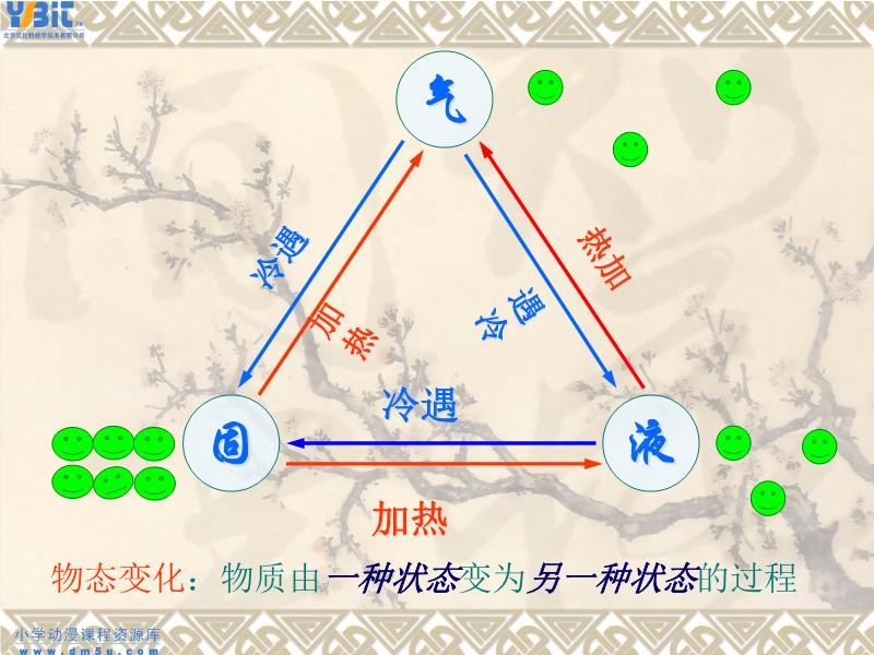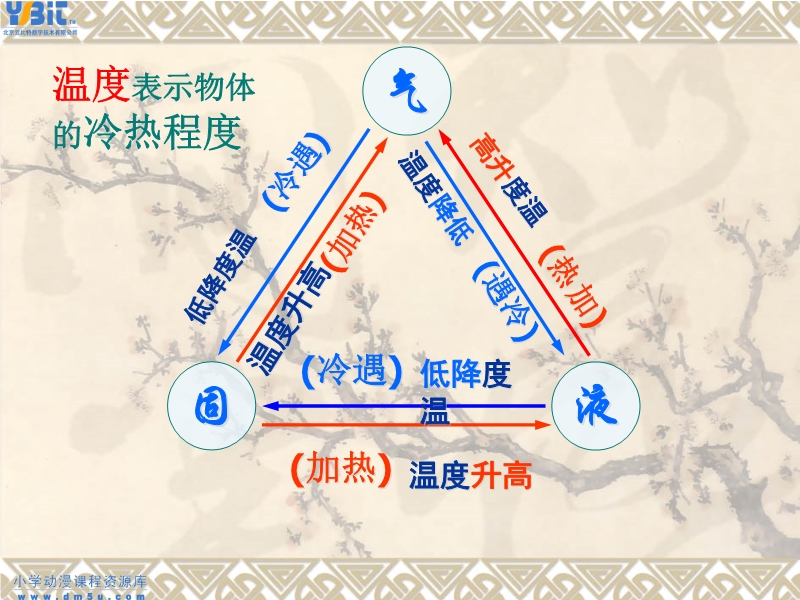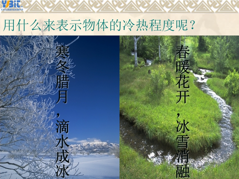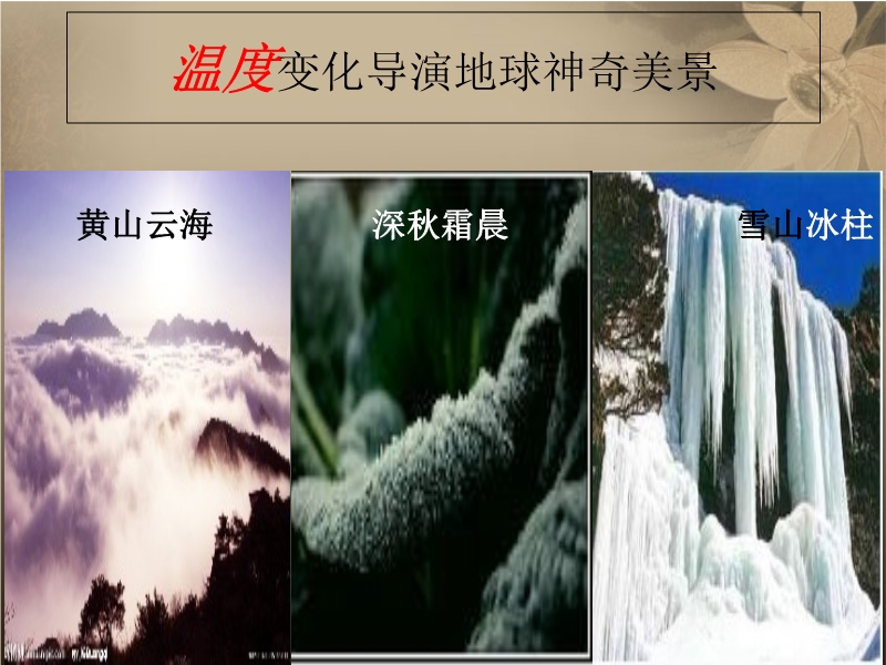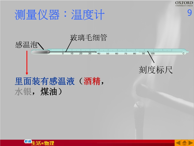 【内容简介】八年级教科版《5.1物态变化与温度》ppt课件,本课件通过展示自然图片激发学生兴趣,引导学生理解物态变化的概念和形式。在演示中自然揭示温度是物态变化的影响因素,然后通过动画演示温度计探究其原理。本课件着力于设置探究实验引导学生探究温度计的使用方法。
