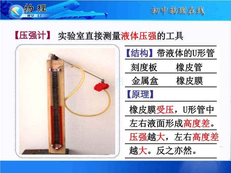 【内容简介】本课件以人教版为基础制作,共有21张幻灯片,插入了2个视频文件和1个flash。课件首先通过图片引导学生认识了液体压强,重点引导学生探究了液体压强的特点,并用该压强计探究了液体的压强与深度、密度的关系,探究了液体的压强的公式等。