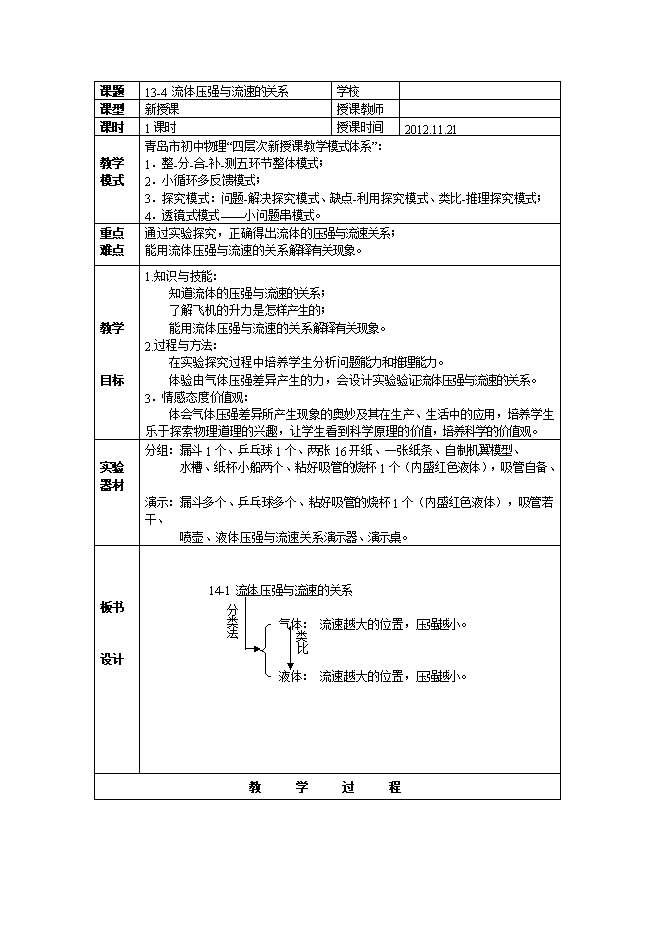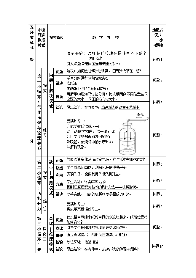 - 7982025春人教版八年级下册物理教学设计:9.5 流体压强与流速的关系(附教学反思)