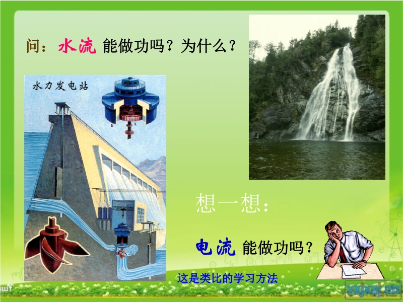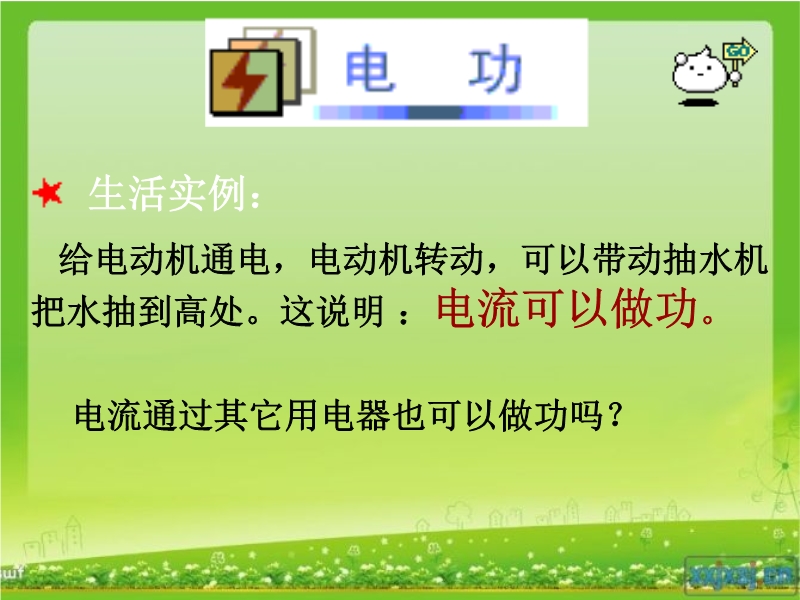【内容简介】本课件以沪科版新教材第十五章第一节为基础制作,共有30张幻灯片,并插入了3个flash动画。课件类比水流做功让学生认识了电流做功,并且通过具体的实例让学生认识了电流做功的实质。课件还展示了电能表,让学生认识了电能表的作用,电流表的读数方法等。重点引导学生探究了电流做功与哪些因素有关,总结了电功的计算公式。本课件可供教学“电功”时参考使用。